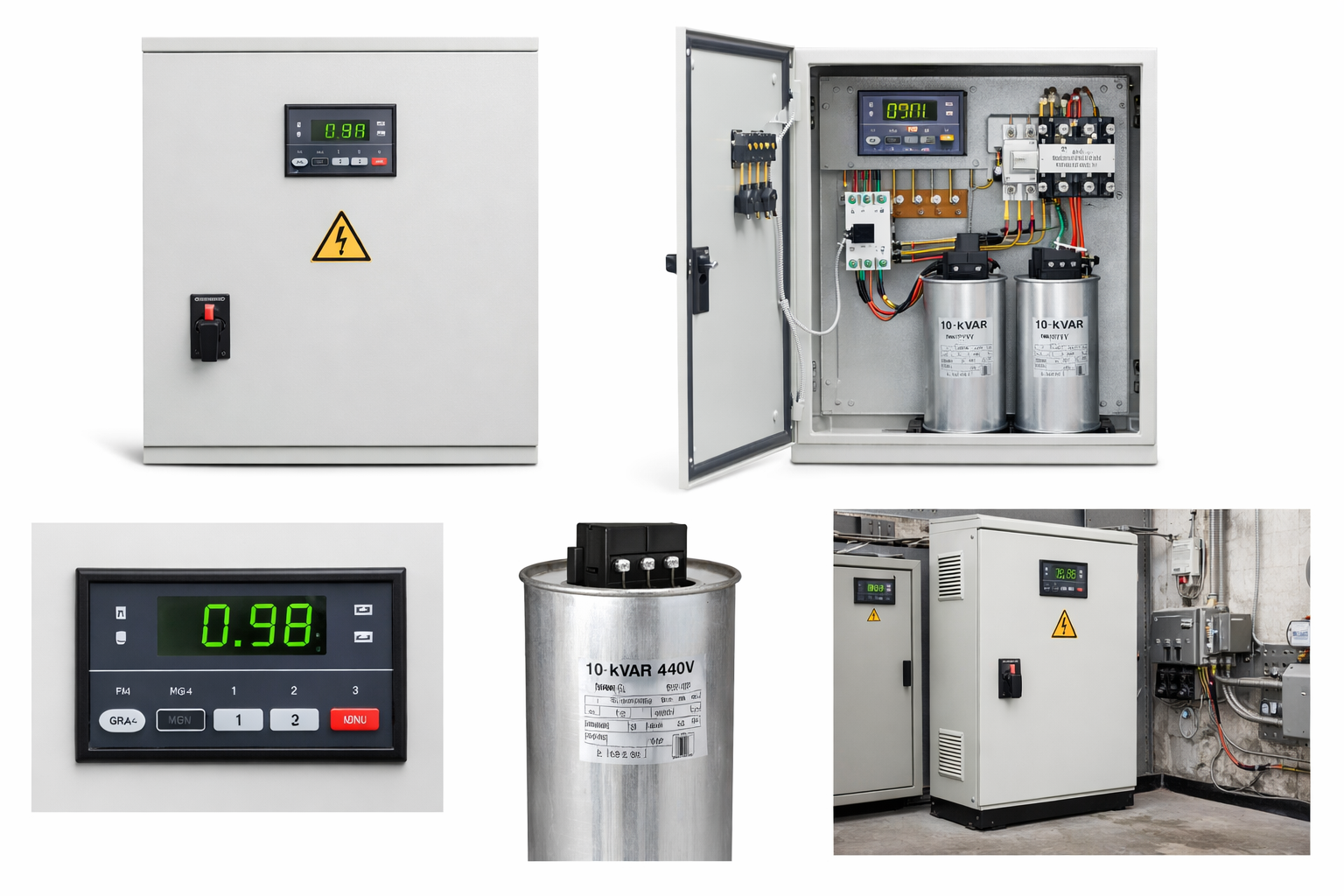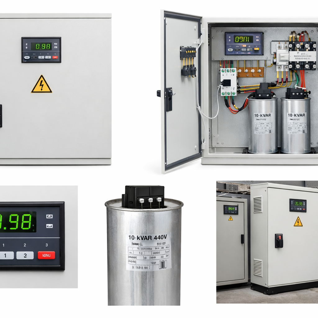 تابلو بانک خازنی 10kVAR سه فاز اتوماتیک یک سیستم اصلاح ضریب توان (Power Factor Correction Panel) در سطح فشار ضعیف (LV) است که به صورت هوشمند توان راکتیو مورد نیاز شبکه را تأمین میکند.